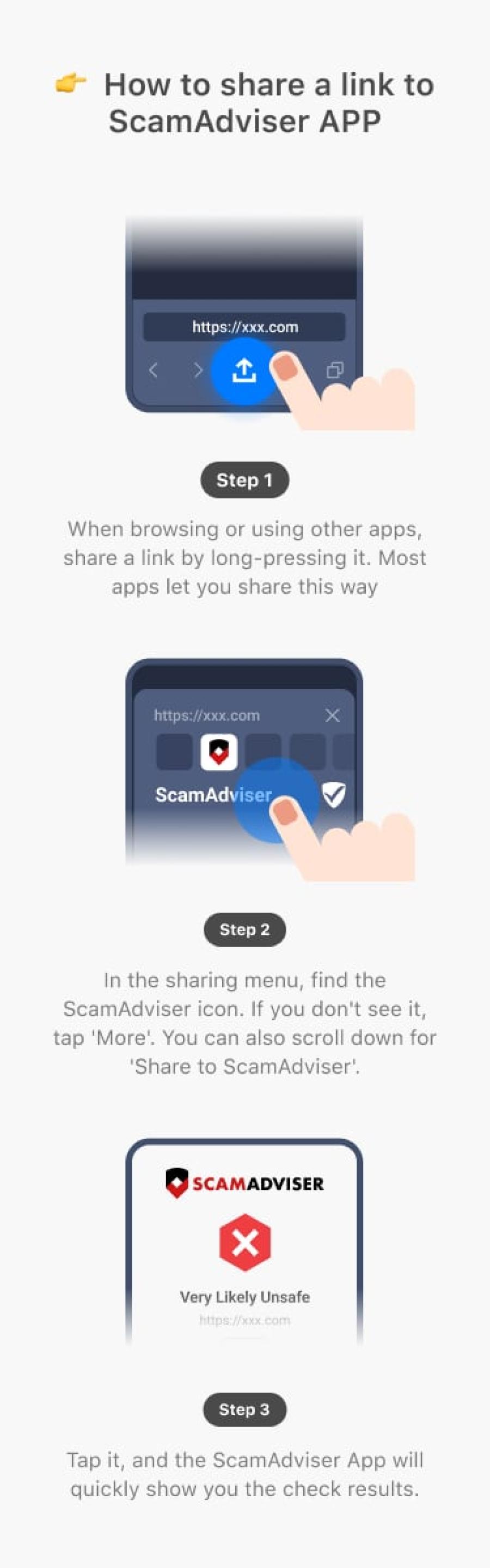 After downloading the app on your phone, kindly follow the steps as detailed below to share a link to the app and get real-time results from ScamAdviser.com: