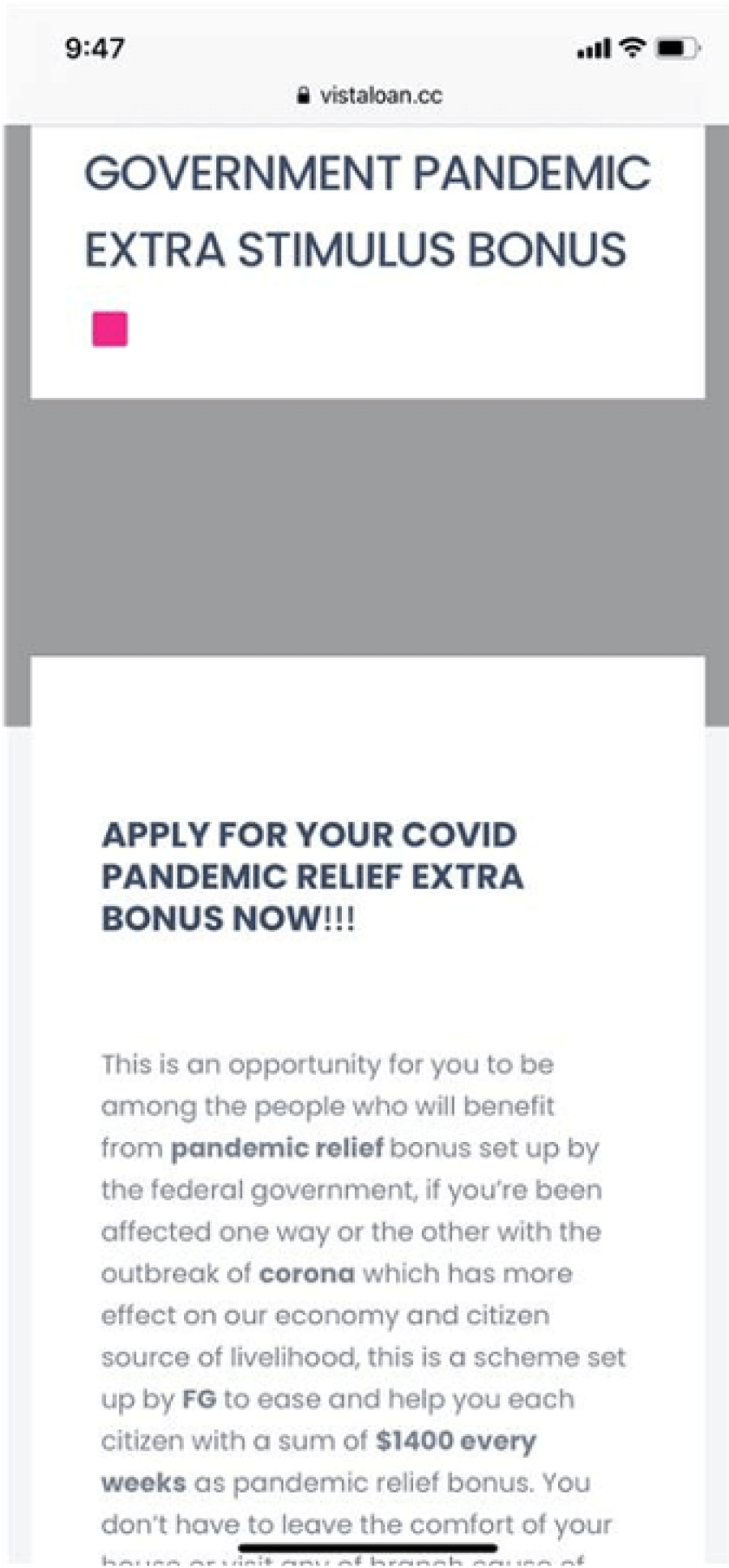 us department of state extra stimulus: get your covid-19 relief fund of $1,400 per-week for the next 26 weeks. for more details, please visit: https[:]//www.vistaloan [. ]cc/ index.php/covid-relief/