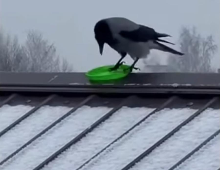 In many videos, a crow seems to place a lid under its feet and slide down a snowy roof, almost like a tiny snowboarder. People are sharing these videos widely, commenting on how clever or entertaining the birds seem to be.