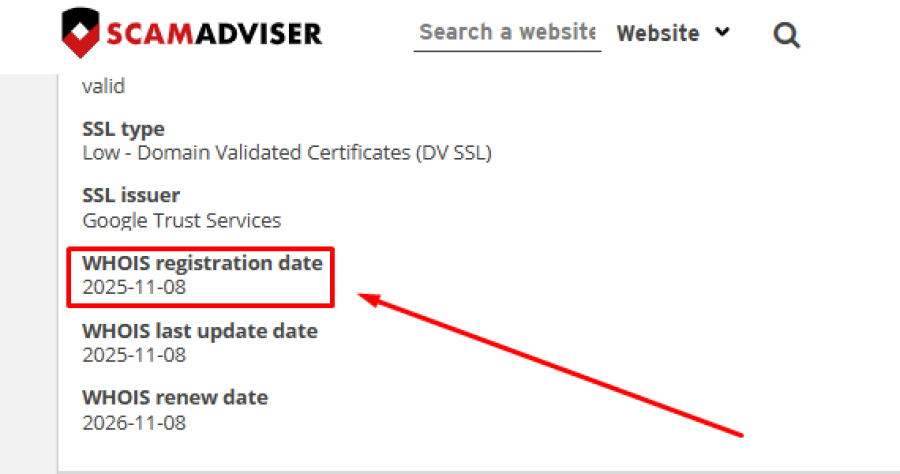 Brand new domains lack history, reviews, and user proof. Scammers often create fresh websites, use them for a short period, then shut them down before people start reporting them.