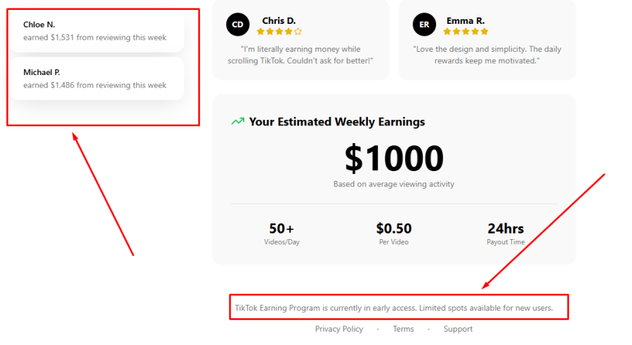 They also push messages such as: “TikTok Earning Program is currently in early access. Limited spots available for new users.”