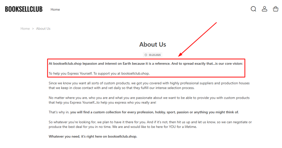 Another suspicious detail comes from the site’s About Us section. Booksellclub.shop claims: