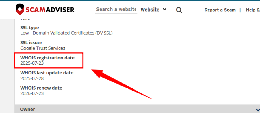 Here’s the catch: no legitimate business uses a free Gmail address as its main contact. Real companies use emails tied to their domain, like report@scamadviser.com.