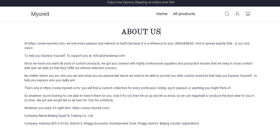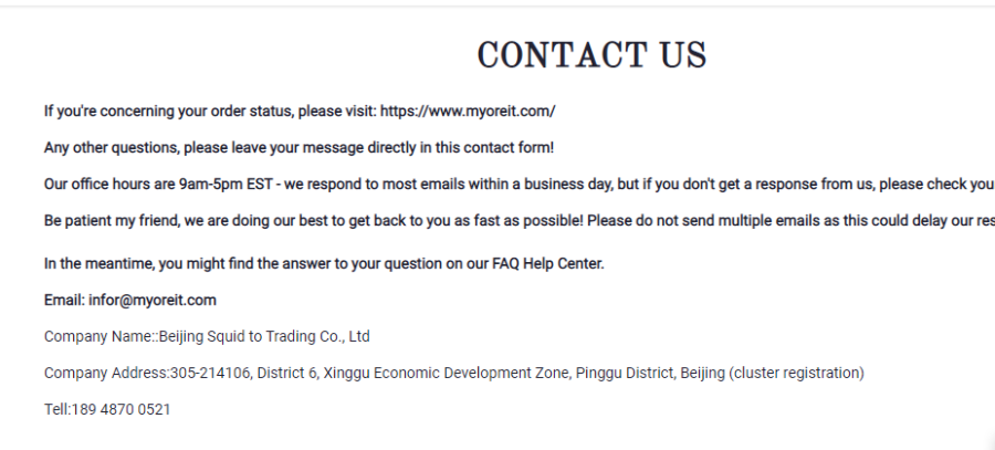 Myoreit.com was started in November 2021 according to their WHOIS information and claims its headquarters are in Pinggu District, Beijing. But the registered company falls under a different name; Beijing Squid to Trading Co., Ltd.