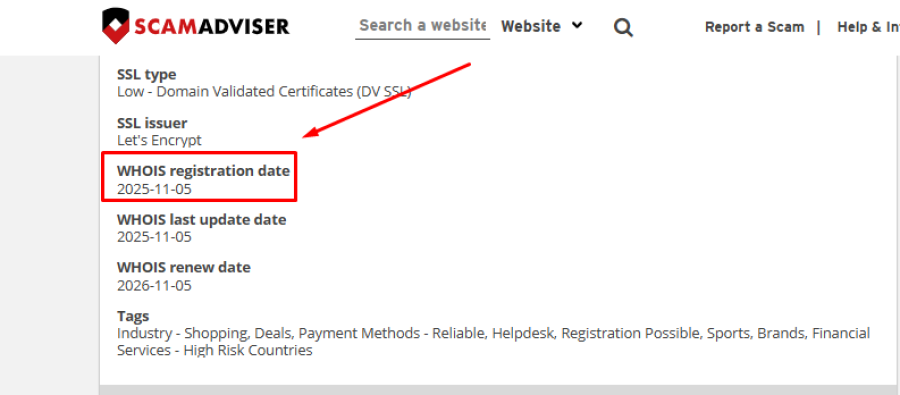 Checking domain tools like Whois and ScamAdviser shows the site was registered on 2025-11-05.