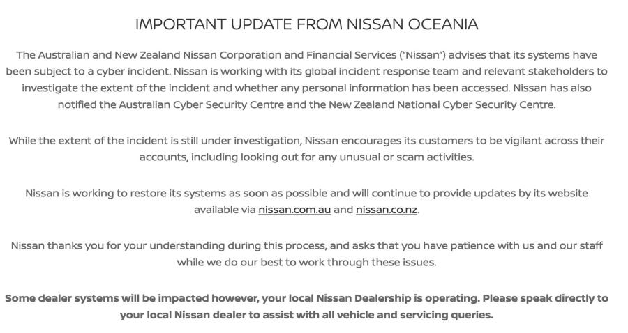 A statement posted on Nissan’s official website read, “The Australian and New Zealand Nissan Corporation and Financial Services (“Nissan”) advises that its systems have been subject to a cyber incident. Nissan is working with its global incident response team and relevant stakeholders to investigate the extent of the incident and whether any personal information has been accessed.”