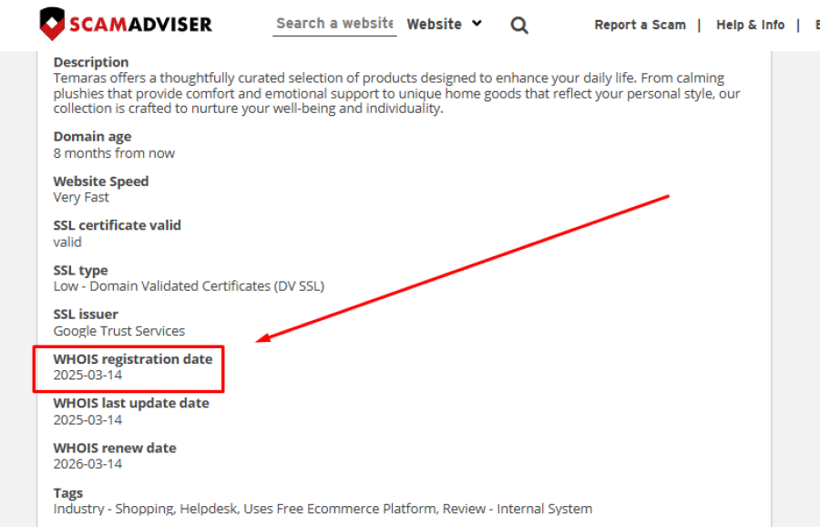 Whois and ScamAdviser show Temaras.com was registered on March 14, 2025.